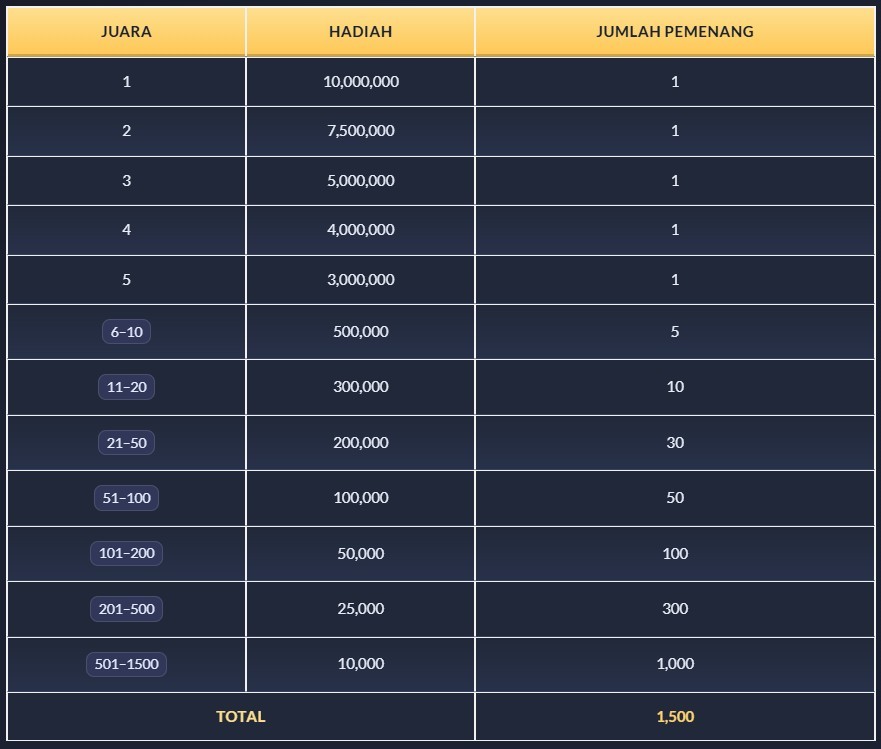 2. Total hadiah sebesar Rp 750.000.000 akan dibagikan kepada 16.500 Pemenang Selama Periode event Berlangsung, dengan kuota 1.500 Pemenang setiap hari!