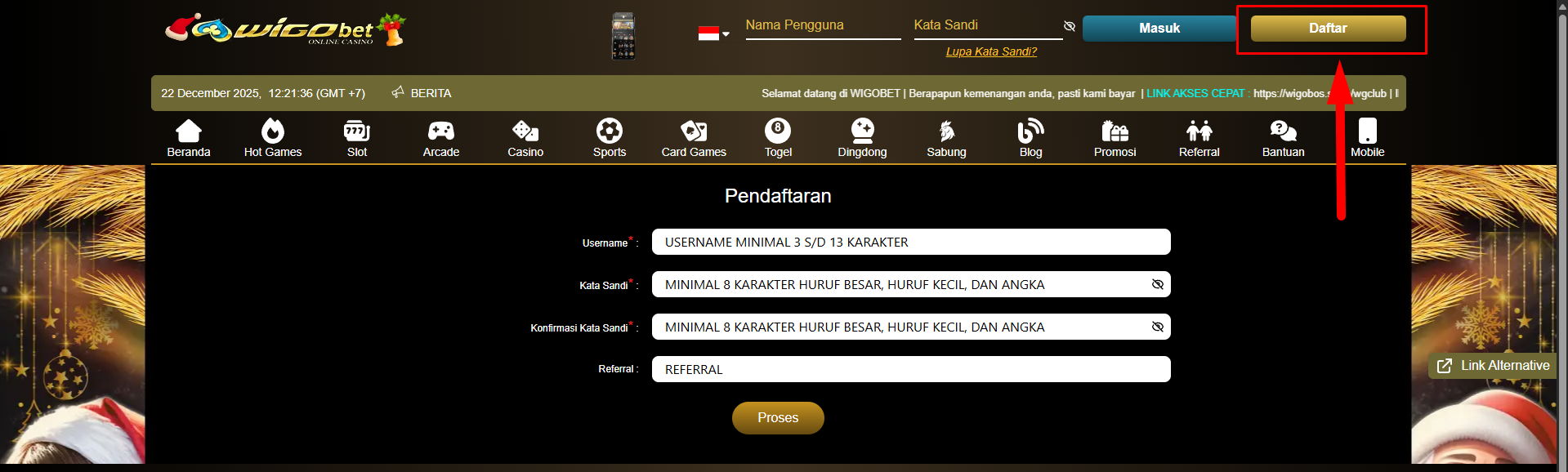 - Klik tombol daftar pada posisi di bagian atas seperti gambar di bawah ini kemudian akan muncul form: