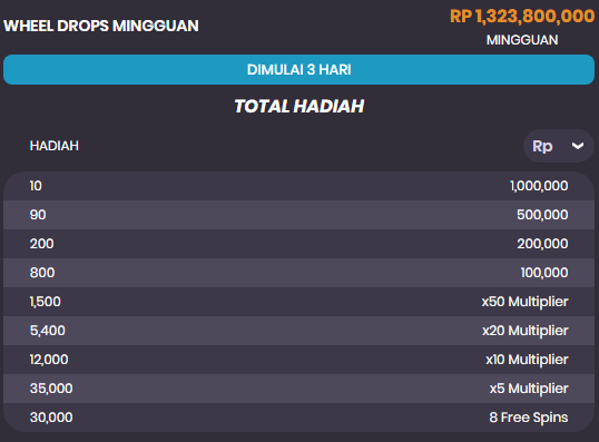 2.Total Hadiah pada promosi ini adalah sebesar IDR 1,431,000,000,- dengan setiap pemain memiliki kesempatan memenangkan hadiah hingga IDR 11,130,000