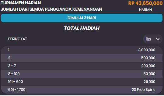 4. Turnamen harian akan berlangsung dari 19:00 WIB hingga 23:59 WIB, dengan 10,000 hadiah harian senilai Rp 2,240,000,000. Akan ada 15 turnamen selama periode promosi