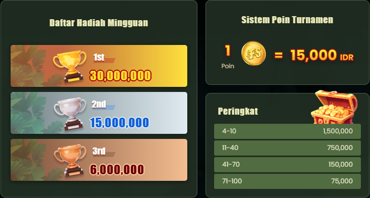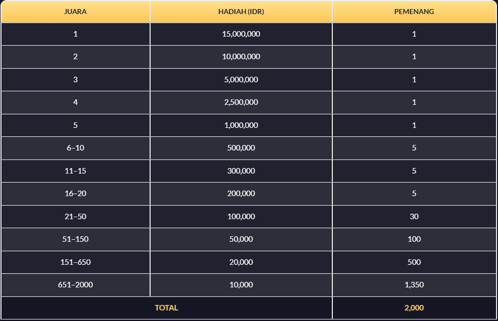 2. Total Hadiah IDR 1.500.000.000 akan dibagikan kepada 6,000 Pemain dengan skor tertinggi di papan peringkat.